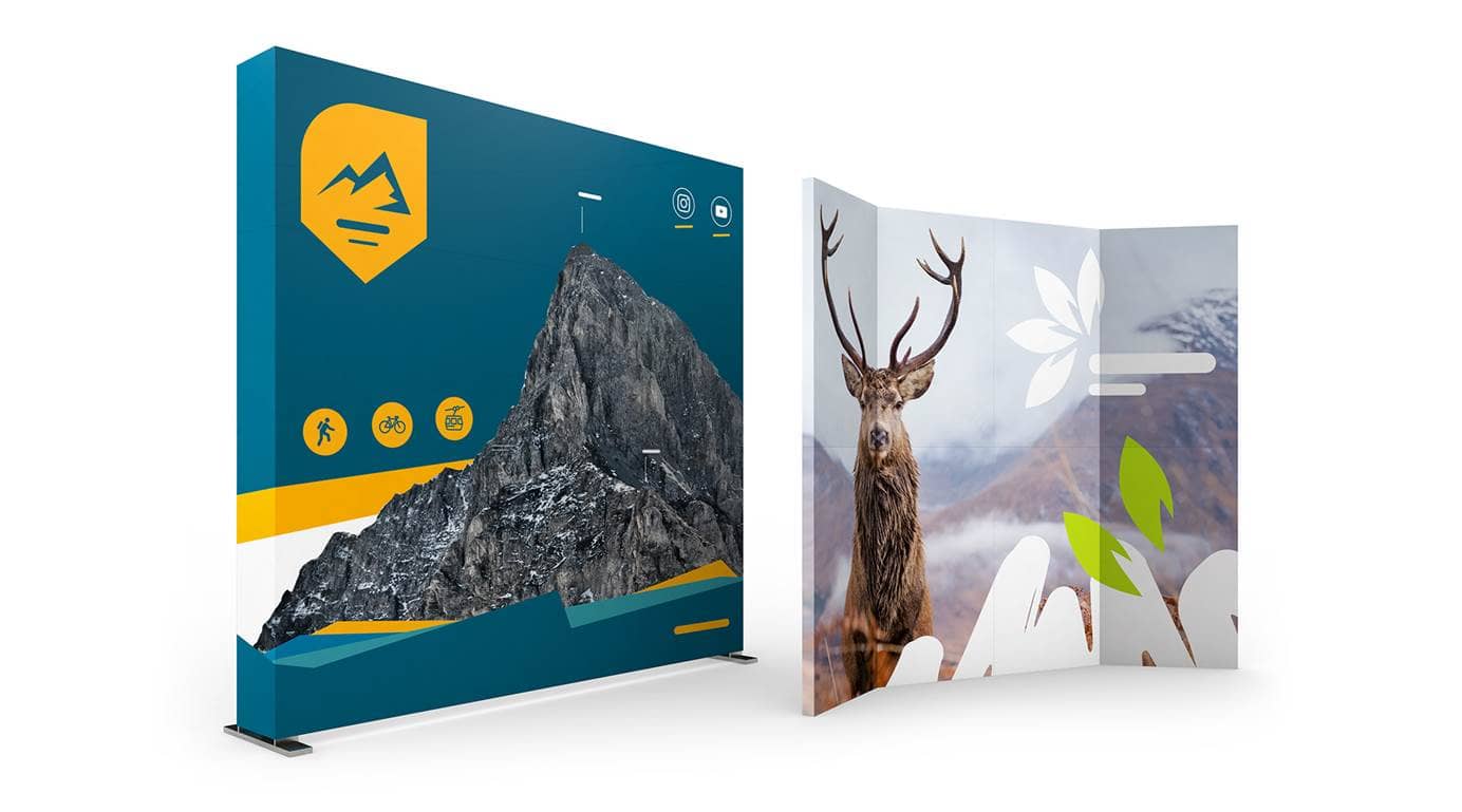 Het tweede beurswandmodel is licht gebogen en komt daardoor innovatiever over. Het PVC-reclamedoek wordt op stevige 430 µ display-banen bedrukt, die i.p.v. met klittenband met magneten worden bevestigd. De correcte uitlijning is ontzettend belangrijk om juist bij tekst of afbeeldingen geen effect te bereiken. Daarom raden wij aan om de ondergrond vooraf te controleren en tijd in te plannen voor het uitlijnen van de stroken.