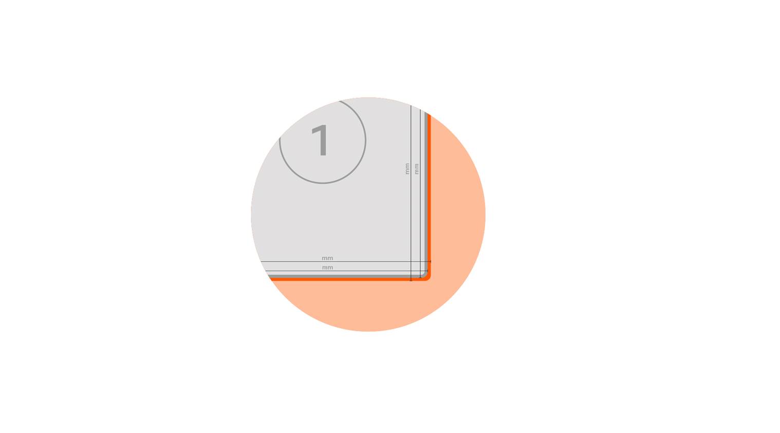 Bovendien adviseren wij vanaf de snijrand een afstand van minimaal 3 mm, beter nog 5 mm, vrij te houden voor tekst- en opmaakelementen om zo een evenwichtig uitzien te verzekeren (5 tot 7 mm, inclusief afloop, tot aan de rand van het drukwerk).